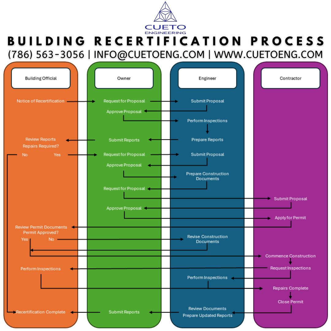 Cueto Engineering has a team of professional engineers that are qualified to perform the required building inspections and prepare the documentation necessary for compliance with building recertification requirements.